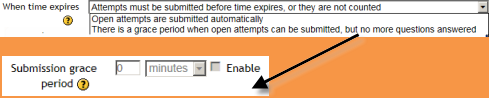 If you select "there is a grace period..." then you can check the box to enable the "Submission grace period" and specify a period of time during which learners may still submit the quiz after the time is up.
