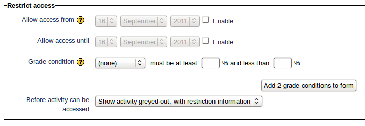 This setting determines any grade conditions which must be met in order for students to access the resource. Multiple grade conditions may be set using the 'Add 2 grade conditions to form' button. If there are multiples completion conditions applied to an activity, it will only be accessible to learners when all grade conditions are met.