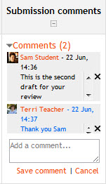 If enabled, students may leave comments into a text area associated with the assignment. Comments can be used for communication with the grading person, assignment progress description, to let students alert the marker about which file is the master file (in case of inter-linked files), or any other type of communication between student and marker.